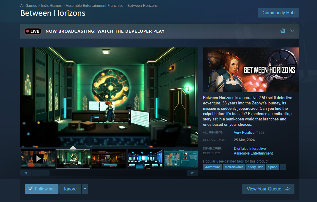 In fall of 2022, DigiTales and Assemble Entertainment officially revealed their second collaboration: sci-fi adventure Between Horizons, formerly codenamed "Storyvania".