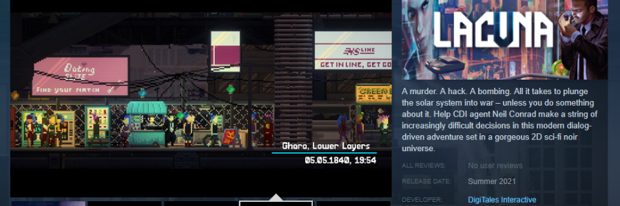 We just announced our first title: Lacuna – A Sci-Fi Noir Adventure. Its Steam page is now live, which feels a little surreal. The game will be published by Assemble Entertainment, a fantastic German publisher who believed in the project from its very start.